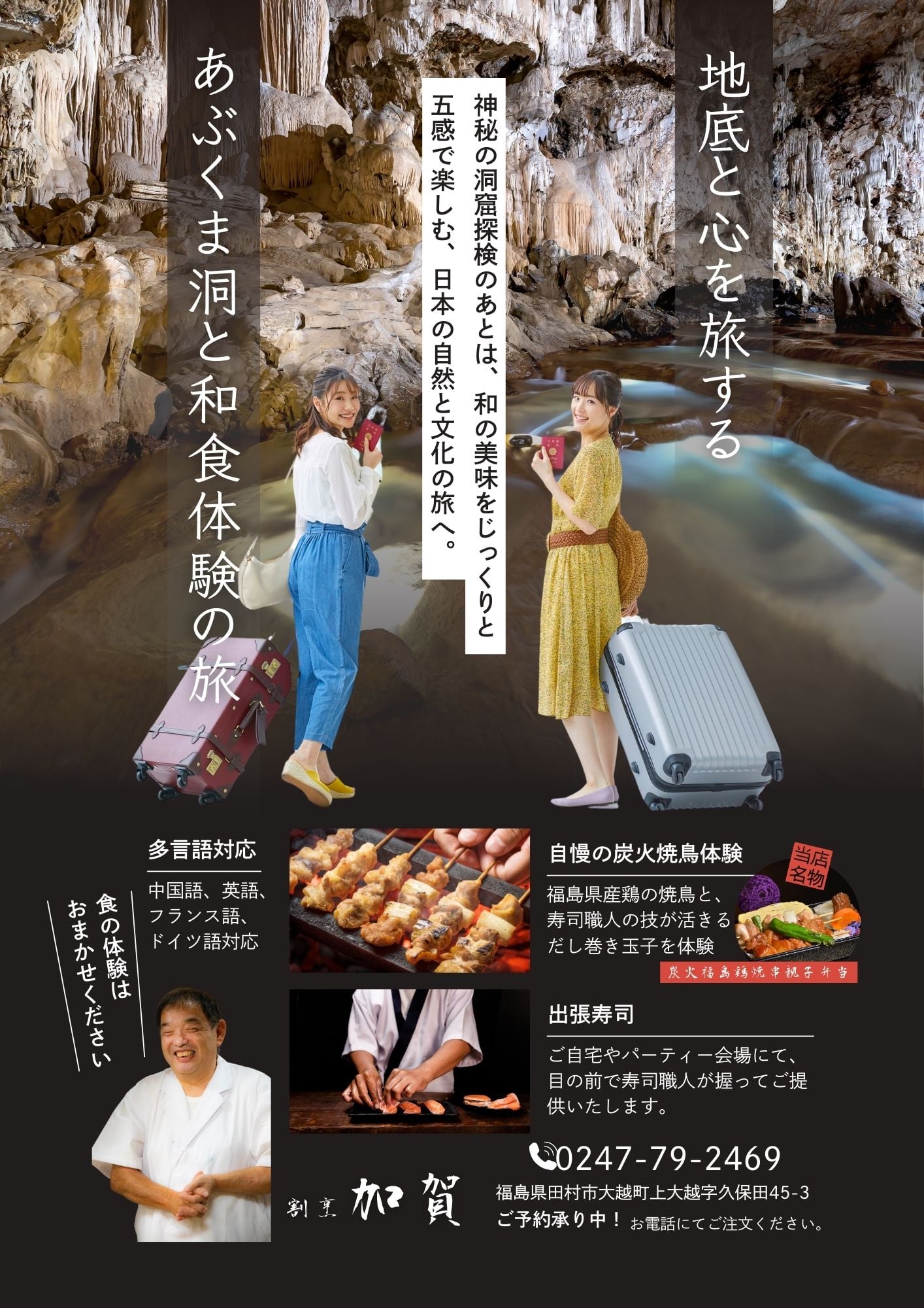 - あぶくま洞は当店から10分、年間20万人強のインバウンド客や国内観光客で賑わっております。