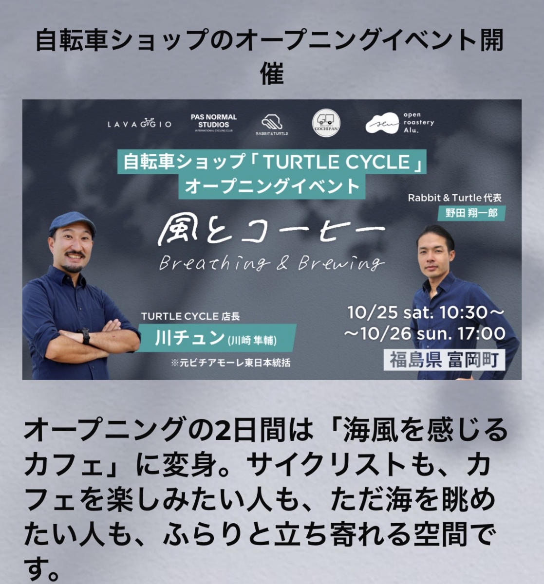 今日は福島チャリ部のメンバーである野田翔一郎さんが富岡町でオープンするスポーツ自転車ショップのオープンイベントのご案内です!
