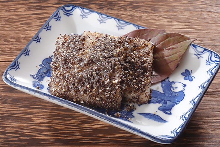 ソバ粉ともち米を練ってのばし、ひし形に切ってゆでたものにじゅうねん(エゴマ)と砂糖をまぶした名物料理。その昔、役人に出したらあまりのおいしさに村民が食べるのをご法度にしたことから呼び名がついたという。ほんのり甘く、もちもちとした食感。